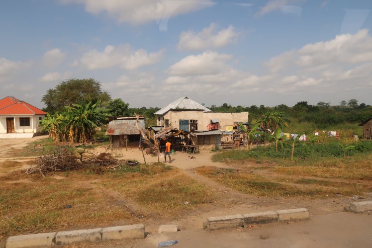 Überall Hütten aber auch Häuser. Die Strasse scheint unendlich zu sein, aber immerhin ist sie geteert. Ab und zu, mehr als uns lieb ist, gibt es vor und nach den Ortschaften eine Bodenwelle. Sehr zum Verdruss derer, die gerade ein Foto schießen wollen.