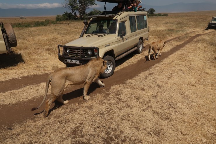 Nach 2 Stunden Fahrt endlich das, was alle sehen wollten: LÖWEN! Die Löwen, wie man auf dem Bild gut sehen kann, versperrten uns die Weiterdurchfahrt, sodass wir anhalten mussten. Nach einiger Zeit merkten wir, dass die Löwen so viele Zuschauer genossen. Sie legten sich unter die Autos und liefen direkt neben unseren Jeeps an uns vorbei.