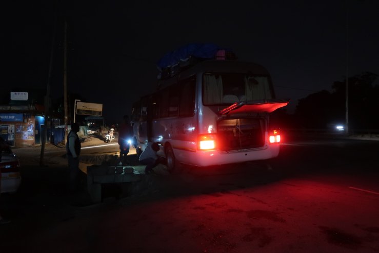 Nach wenigen Minuten jedoch musste bereits eine Pannenpause eingelegt werden, da sich zwischen die beiden Räder an der linken hinteren Seite des Wagens ein großer Stein geklemmt hatte. Diese Panne war im ersten Moment sehr ärgerlich, aber letztendlich waren alle froh, dass wir sie am Anfang der Reise und nicht später hatten.